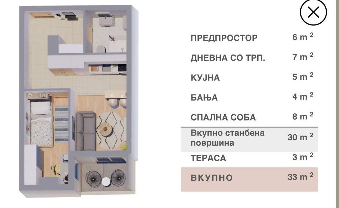 Се продава стан 33м2 во нова зграда во Аеродром во близина на слаткарницата Делиција. Станот располага со дневна соба со трпезарија и кујна, спална соба, ходник, тоалет и тераса од 3м2. Се наоѓа на 10/10 кат со лифт, има С/И ориентација и централно парно греење.